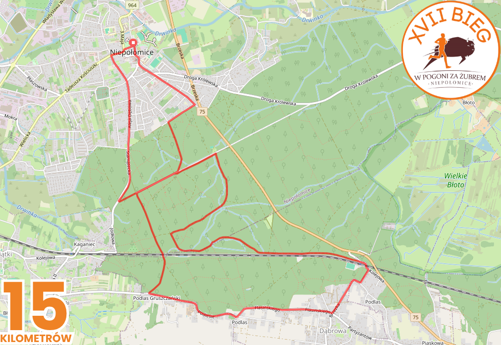 Trasa Biegu na 15 km prowadzi ulicami Niepołomic, leśnymi ścieżkami szutrowo-asfaltowymi w Puszczy Niepołomickiej oraz drogą asfaltową wzdłuż Puszczy.